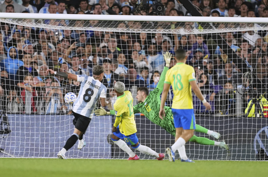 当阿根廷推进到巴西禁区前沿时,巴西的防线其实仍处于相对紧凑的阵型中。然而,由于缺少锋线球员的回防支援,阿根廷球员可以轻松在外围传导寻找机会。阿根廷的右后卫莫利纳无人盯防,他从容前插并送出精准传中,让恩佐得到了绝佳的射门机会。
